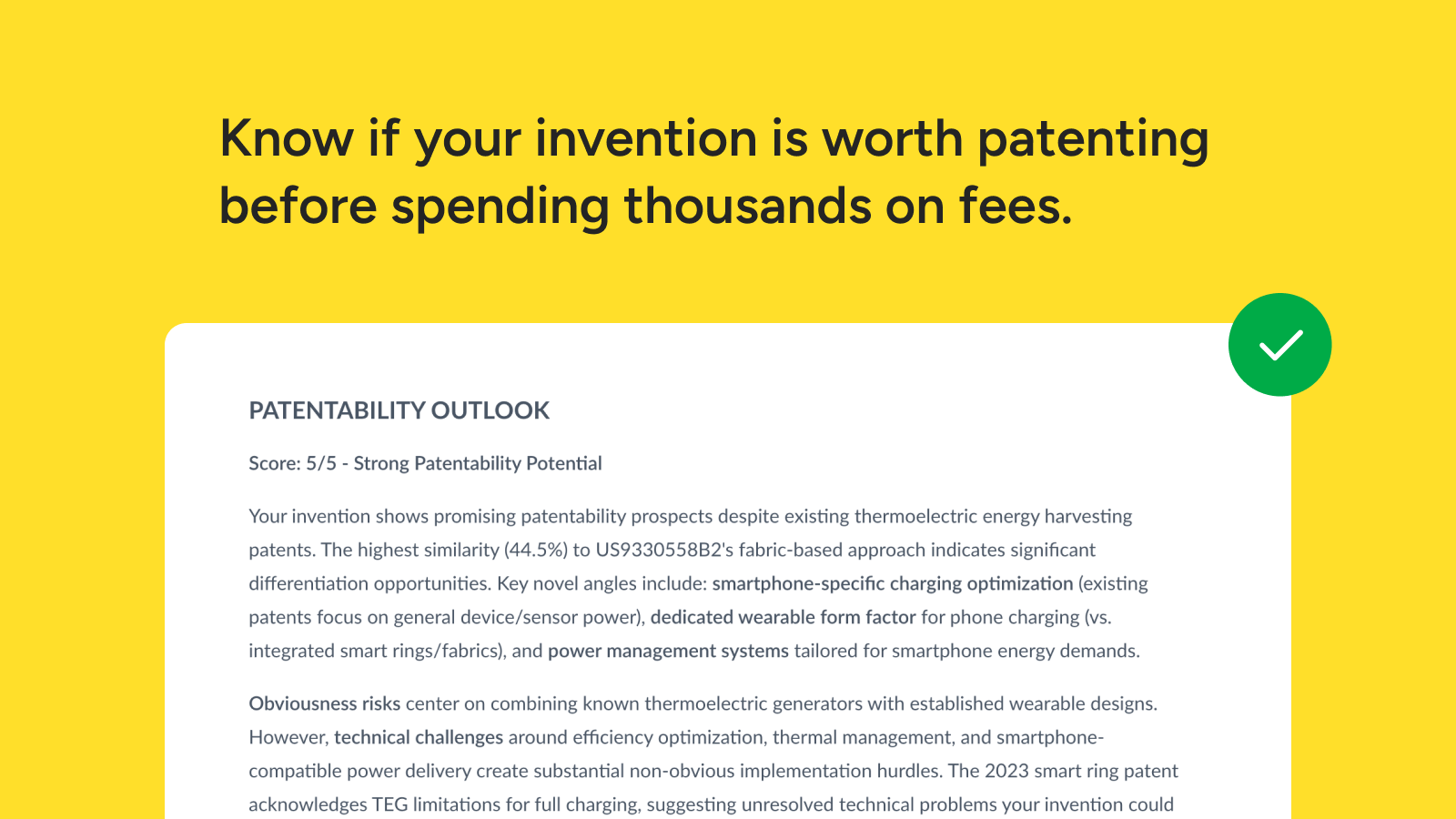 - Confidence in development: Move forward with your prototype knowing you’ve done your due diligence on the concept's originality.