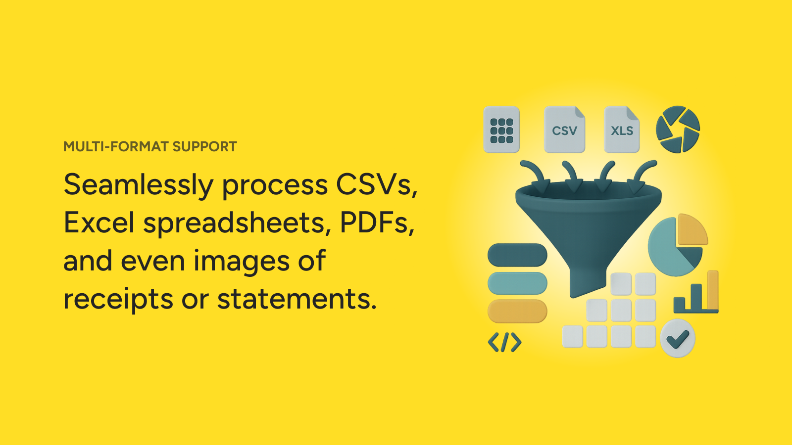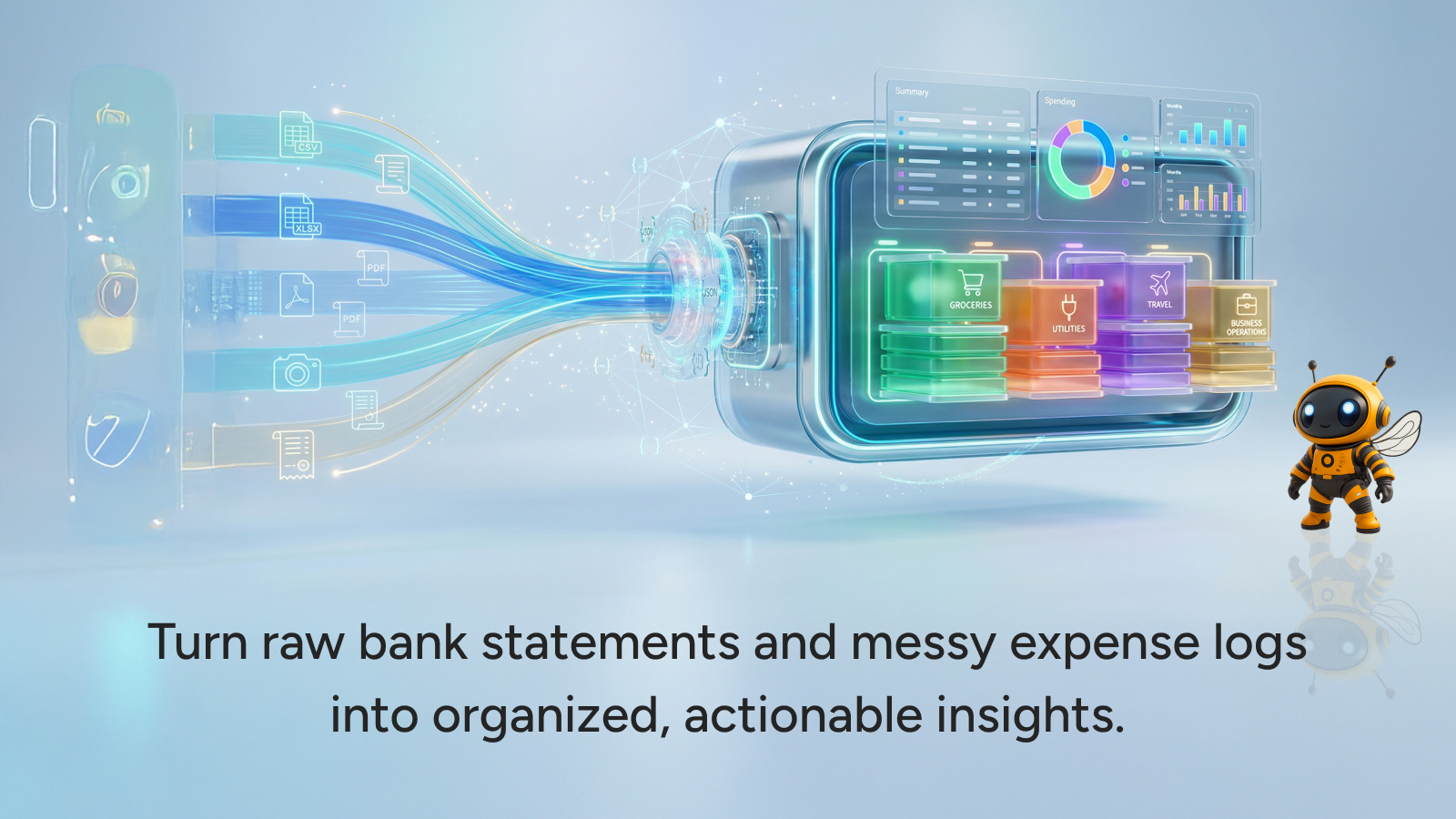 - Multi-format input: Easily upload transaction data from PDF documents, image files, or CSV spreadsheets.