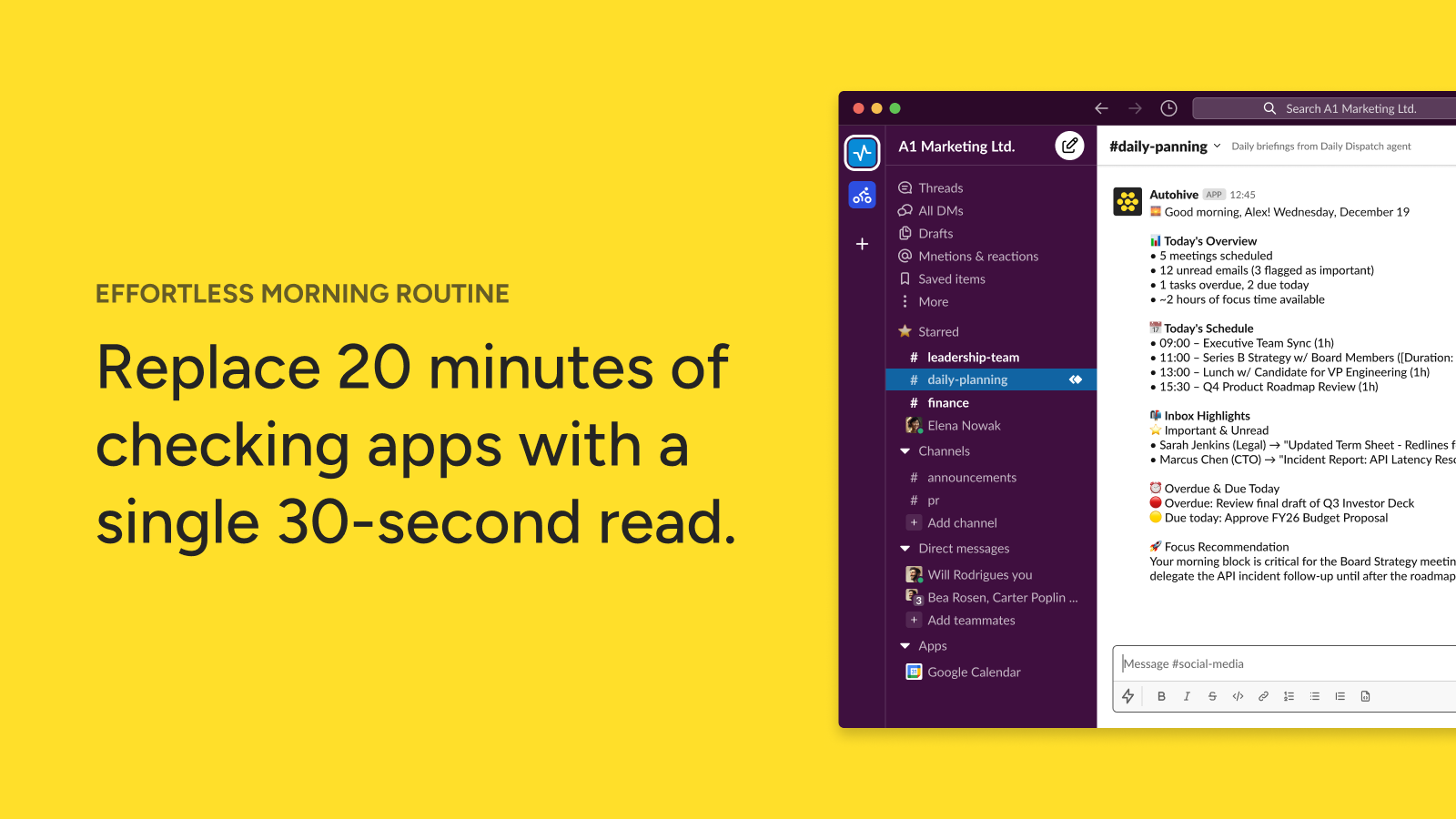 Elevate your workday with the Daily Briefing agent, a powerful tool for productivity automation. This agent transforms your Google Calendar and Gmail into a smart, prioritized overview, delivered directly to your chosen Slack channel, offering effective Slack integration for your daily routine.