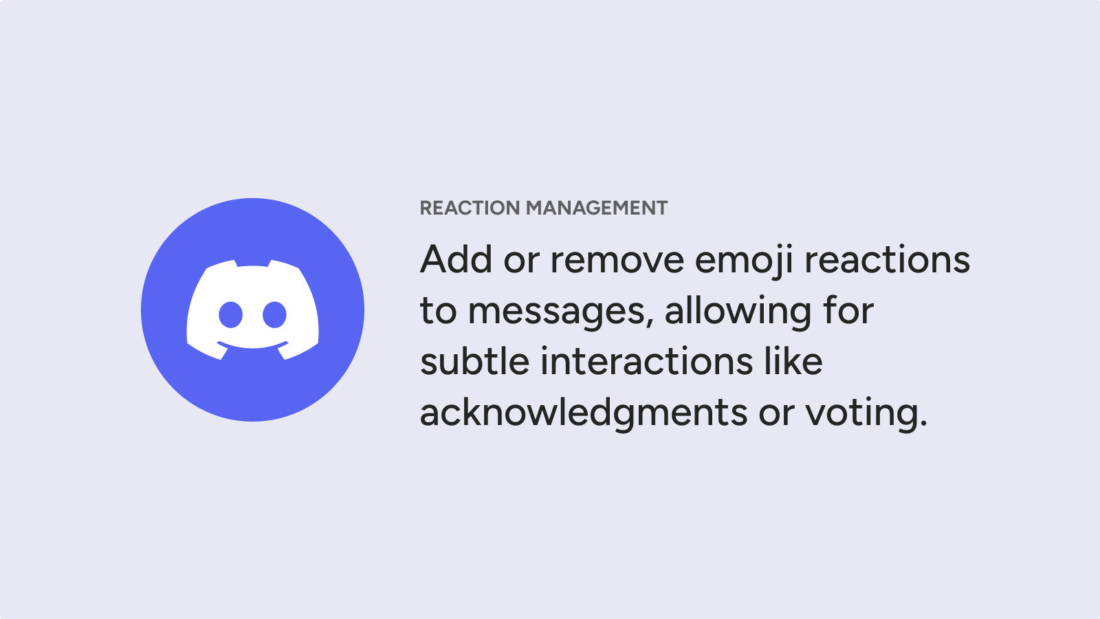 - Manage reactions: Automatically add or remove emoji reactions, simplifying tasks like moderation, polling, or message acknowledgement.