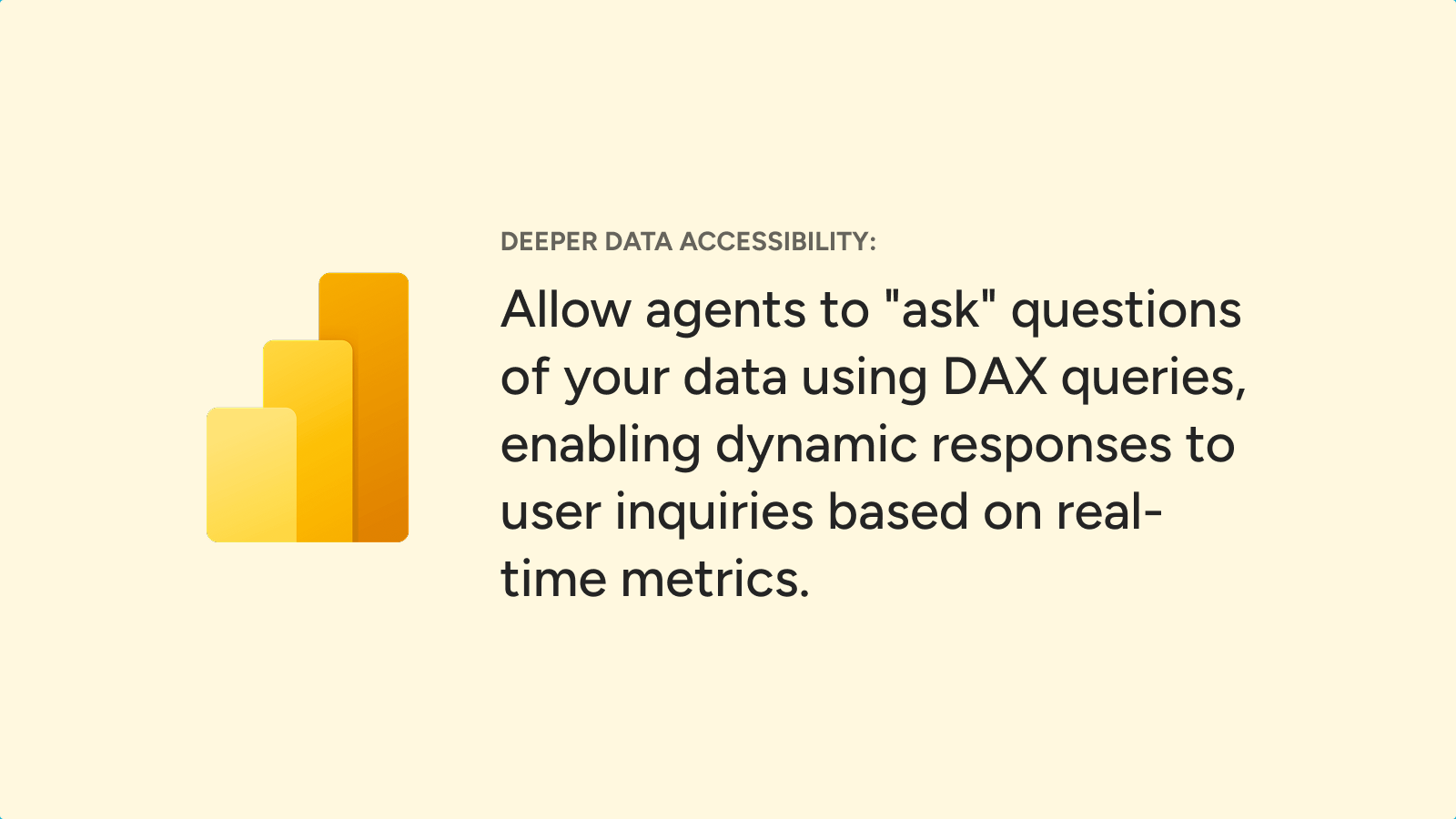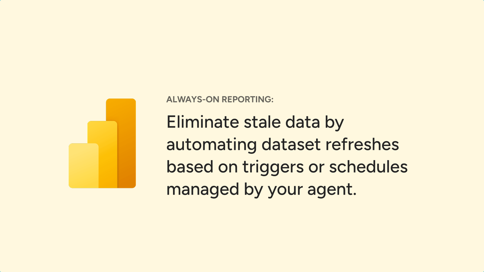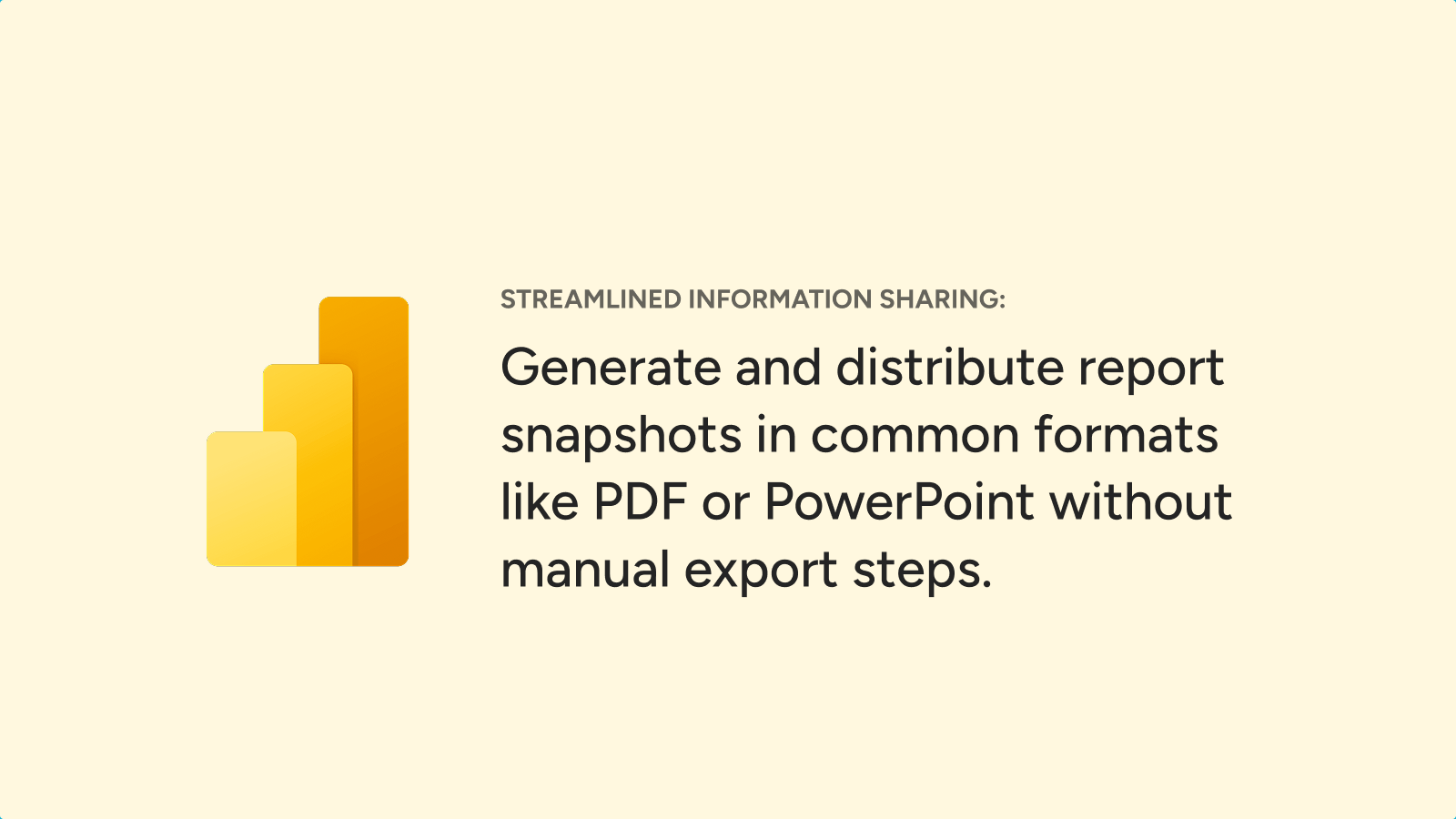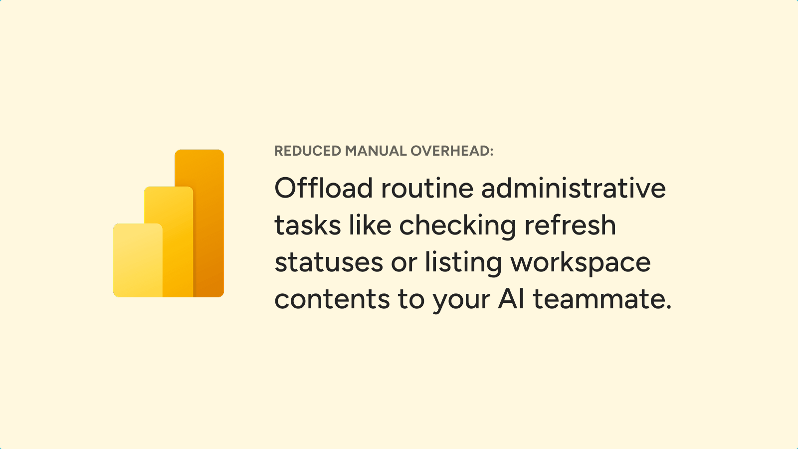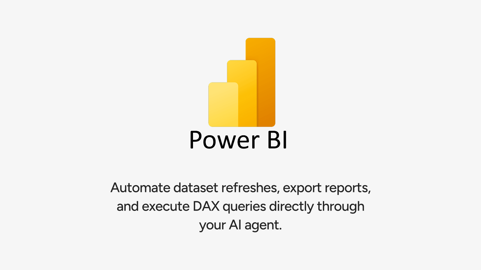 - Report actions: List, get details, clone, and refresh Power BI reports. Export reports to formats like PDF, PPTX, or PNG, and track export status.