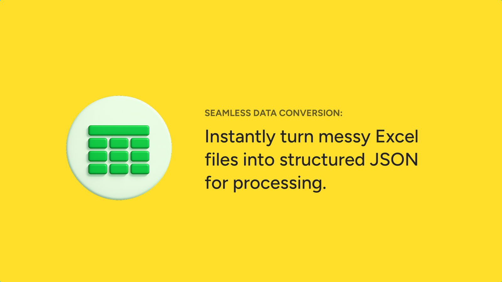 Automate the extraction of critical information from various spreadsheet formats. This integration eliminates the need for manual data preparation, reducing errors and saving significant time in your workflows. It ensures your data is consistently structured for use with APIs, databases, or other business applications, enhancing overall data workflow efficiency and reliability. Easily incorporate data from reports, downloads, or custom spreadsheets into any system that accepts JSON.