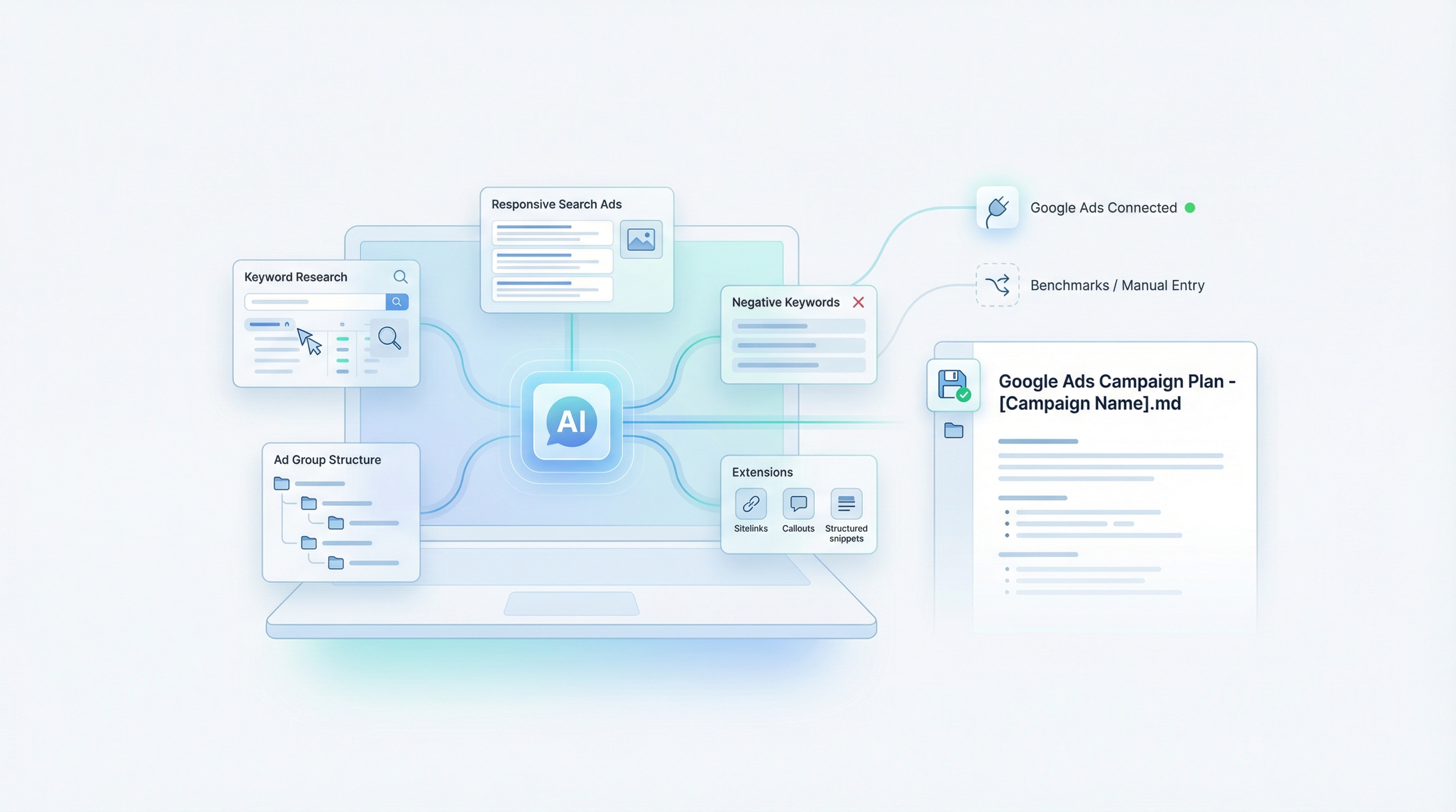 - Builds a complete campaign plan with keywords, ad copy, and structure