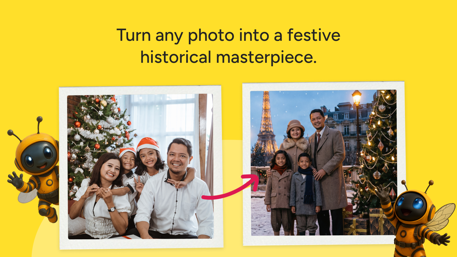 - Effortless photo transformation: Upload any personal photo, and watch it become part of a festive scene.