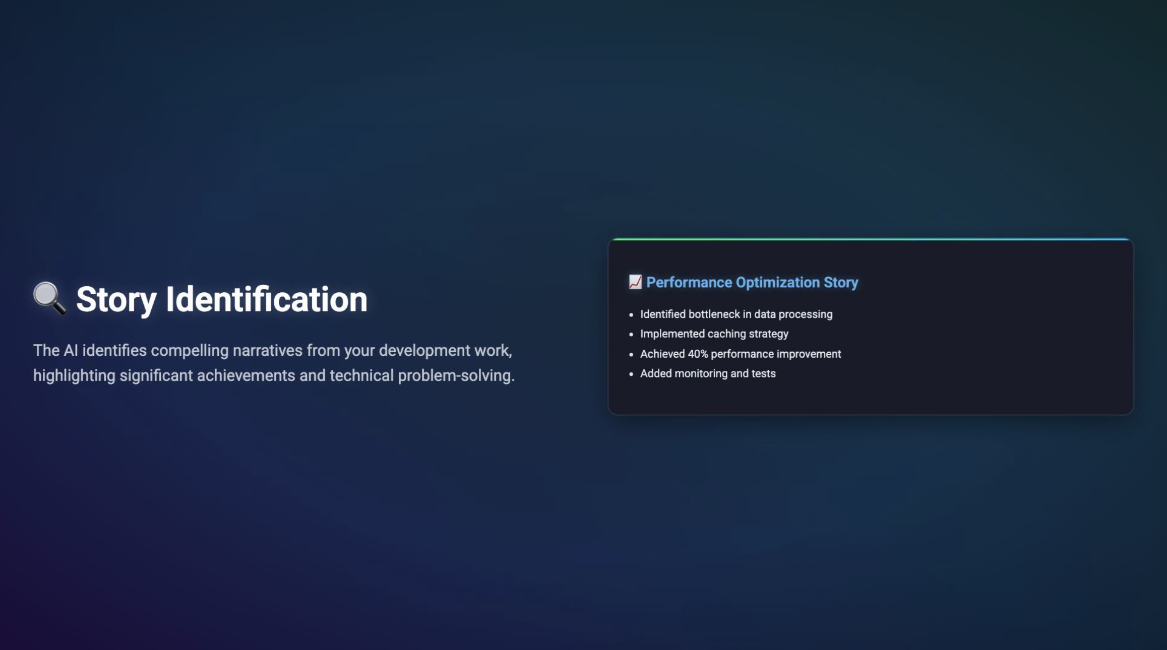 - Story identification: It finds compelling narratives and significant contributions from your development history.