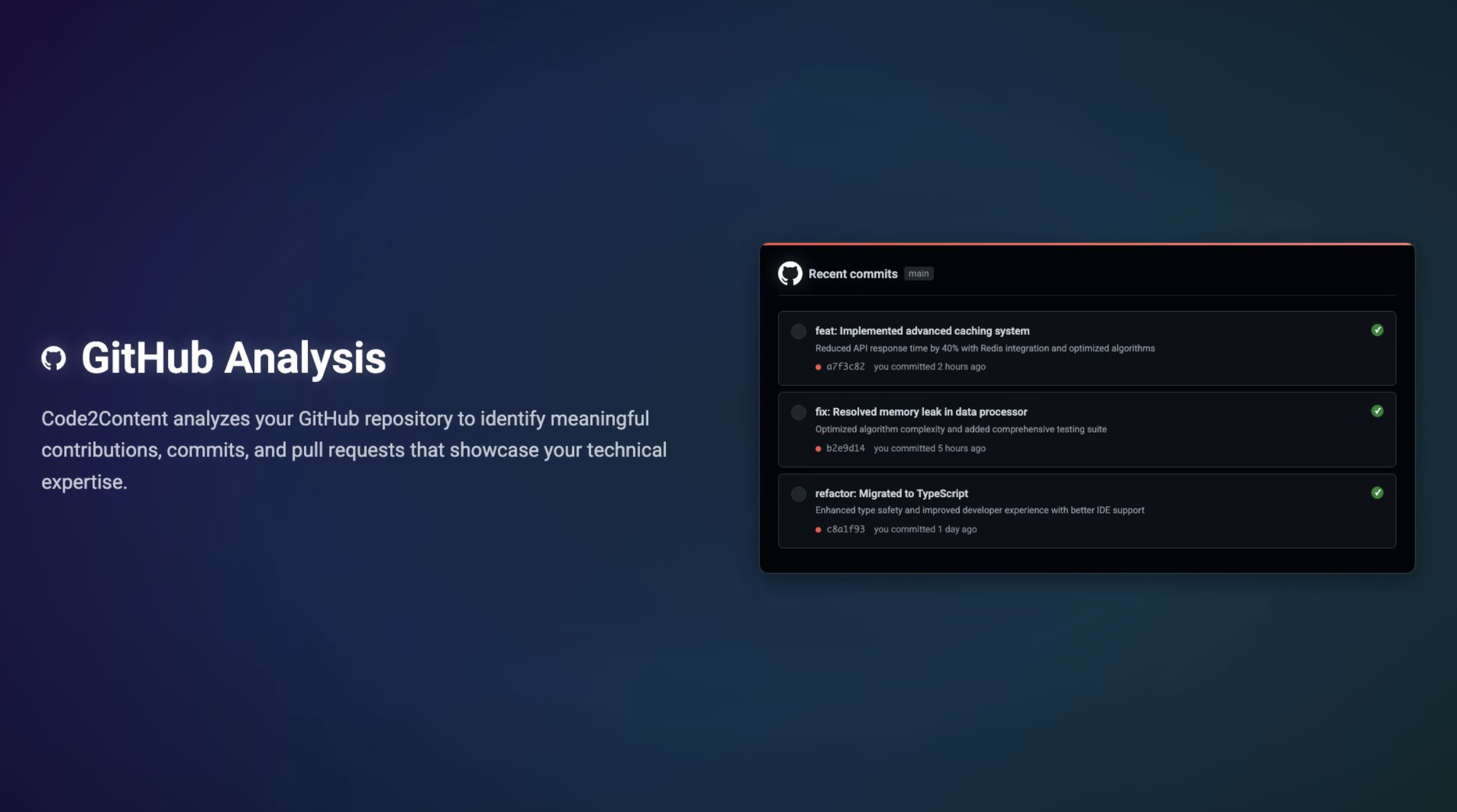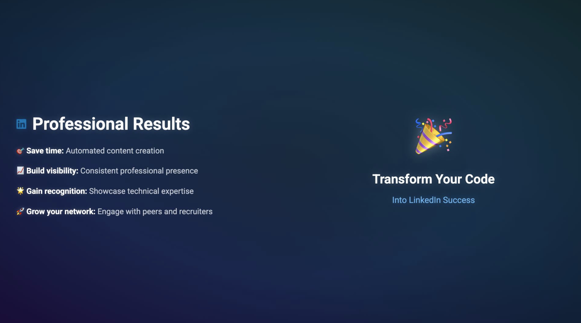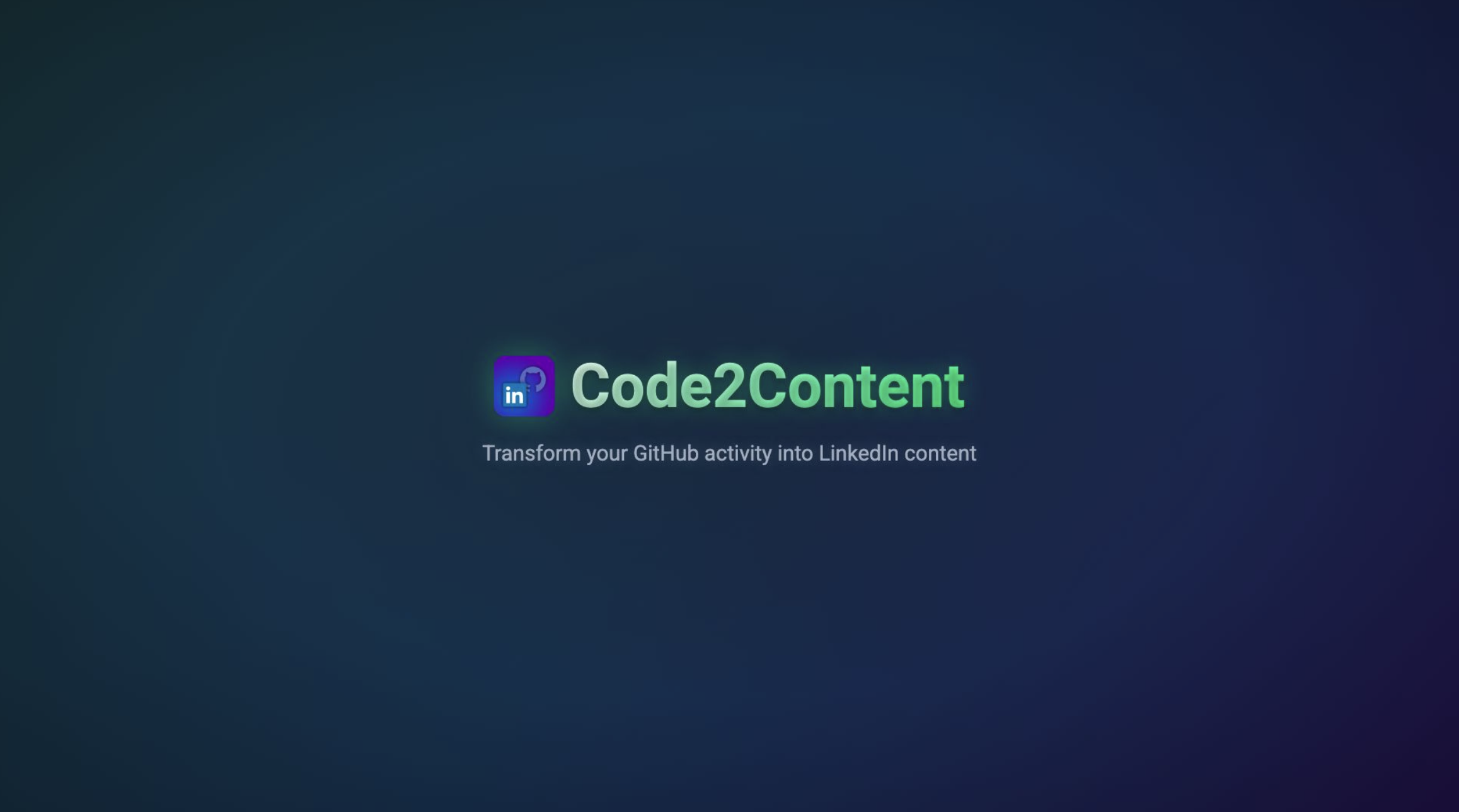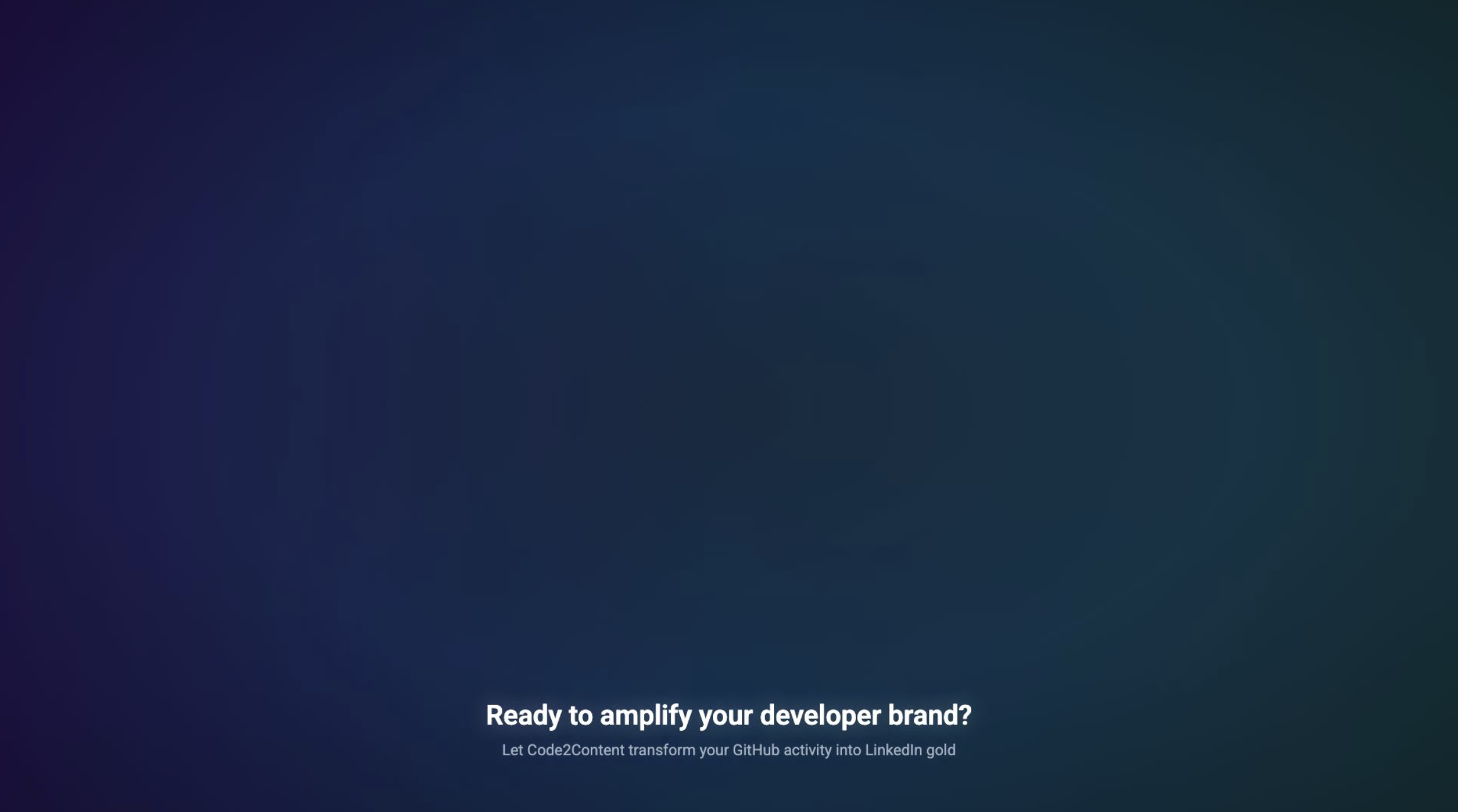 - Professional post generation: Code2Content drafts engaging LinkedIn posts tailored to highlight your technical efforts and project impact.