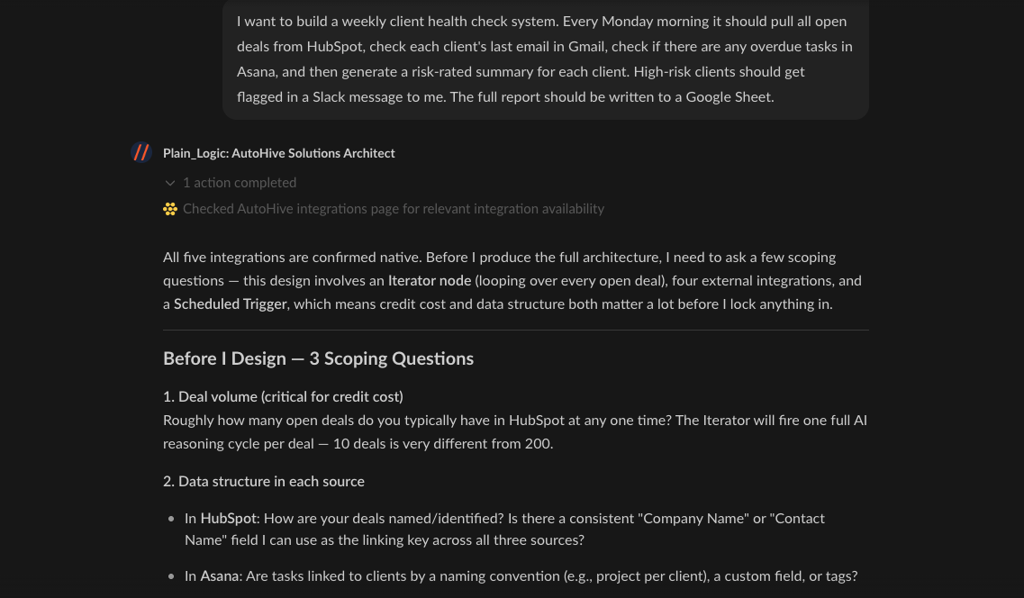 Describe a business process you want to automate — even loosely — and the Autohive Solutions Architect will design a complete, implementation-ready workflow you can build straight away. It handles the architecture so you can focus on building.