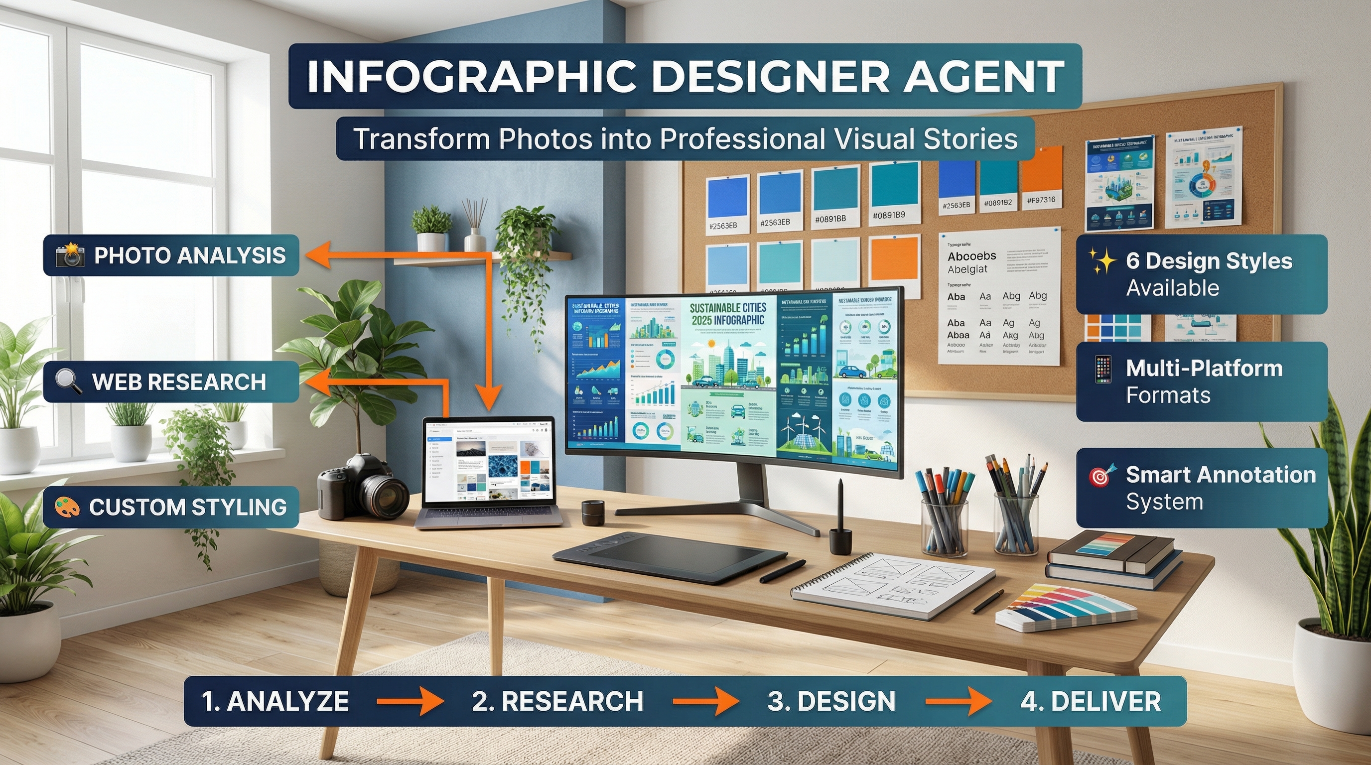 Elevate your product visuals with the Product Infographic Studio. This agent transforms ordinary product photos into compelling product infographics, complete with detailed labels, clear arrows, and explanatory text to highlight key features. Simply upload your product image, and the studio will research relevant details and meticulously annotate it, creating professional-grade visual explanations for your marketplace listings, marketing materials, or presentations.