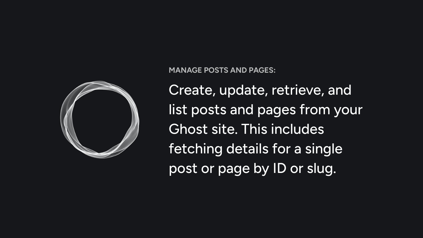 - Manage posts and pages: Create, update, retrieve, and list posts and pages from your Ghost site. This includes fetching details for a single post or page by ID or slug.