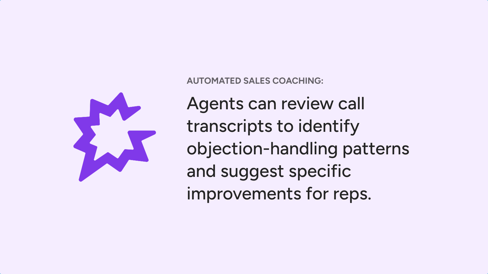 - Enhanced sales coaching: Automatically identify coachable moments or successful sales techniques from call transcripts.