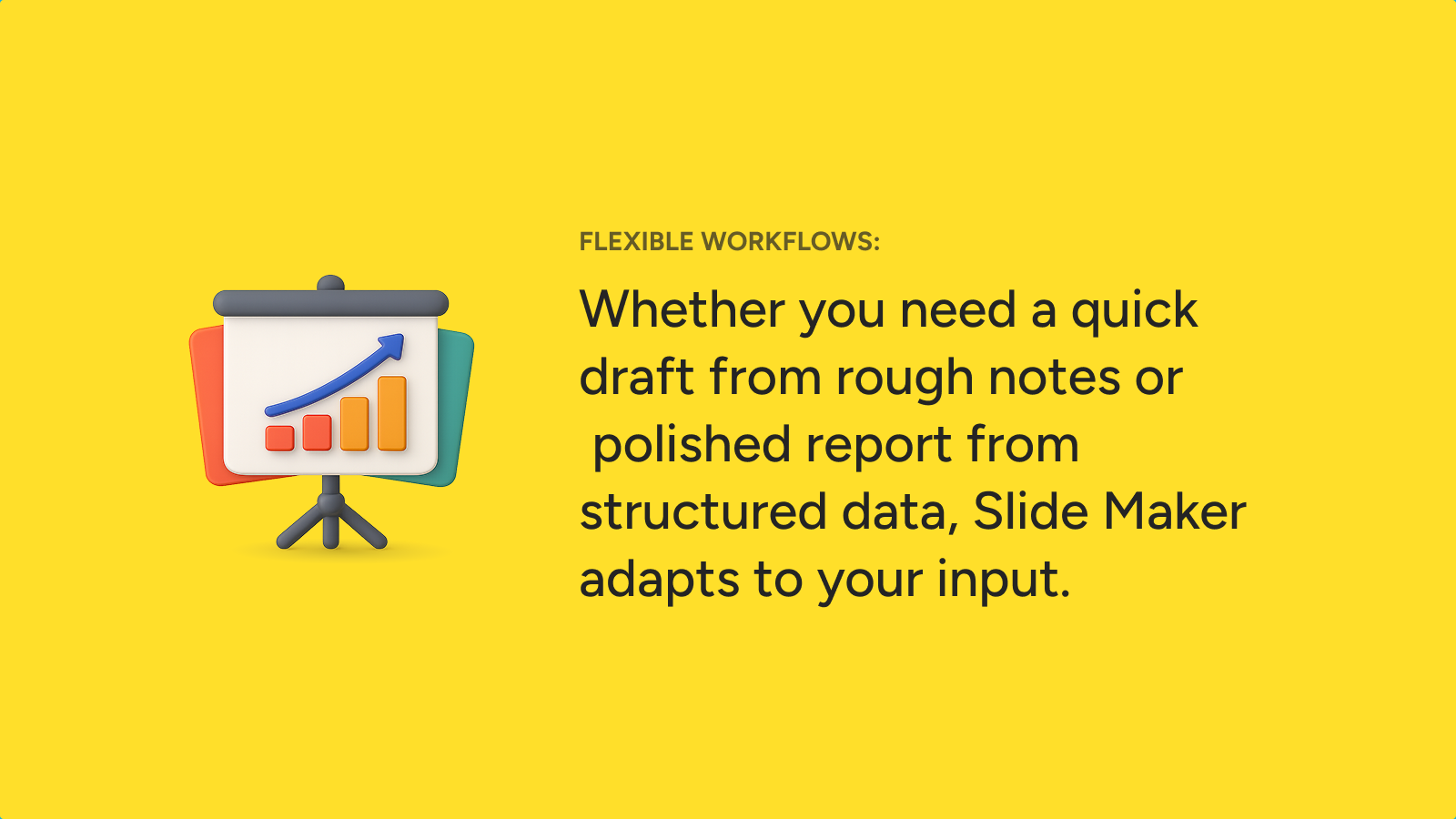 This integration tackles common challenges in presentation generation, such as manual formatting, inconsistent branding, and the complexity of dynamic content placement. By providing a unified and intelligent interface, Slide Maker allows your AI agents to produce high-quality presentations quickly and accurately. This results in significant time savings and a consistent, professional output for all your automated presentation needs.